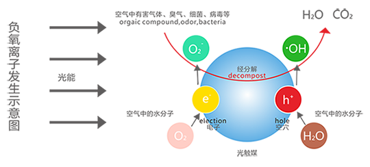 負離子生態硅晶板在光能的作用下產生高氧化性羥基自由基,能氧化包括難以生物降解的物質在內的大多數有機污染物和部分無機污染物,例如:甲醛、甲苯、TVOC等。能將其最終降解為CO2和H2O、無害鹽類及無機酸等小分子。而且羥基自由基對反應物的選擇性幾乎為零。
