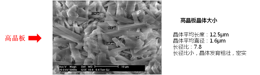 由以上微觀圖可以看出高晶板的晶體形狀更加粗壯、結(jié)晶結(jié)構(gòu)網(wǎng)更加致密,長徑比更小。同時(shí)也帶來了更長的產(chǎn)品使用壽命。