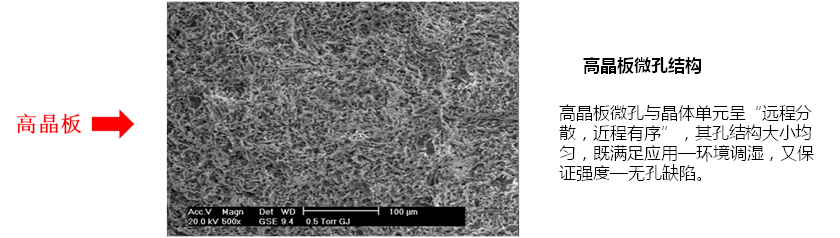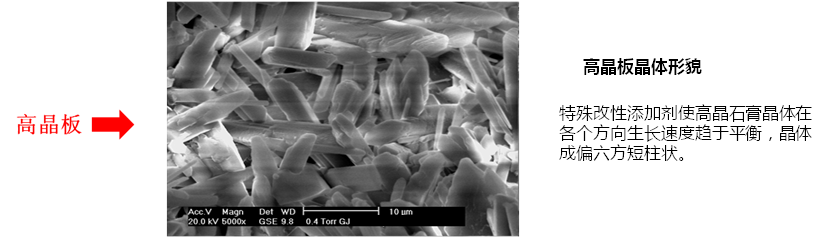 高晶板的主要成分是天然石膏以及石膏改性外加劑、有機(jī)硅防水外加劑、改性配料、玻璃纖維等。他的晶體結(jié)構(gòu)是短柱狀的,同時(shí)防水外加劑與晶體構(gòu)成整體防水體系,因此高晶板的強(qiáng)度得到極大的提高、防水防潮性能優(yōu)異。