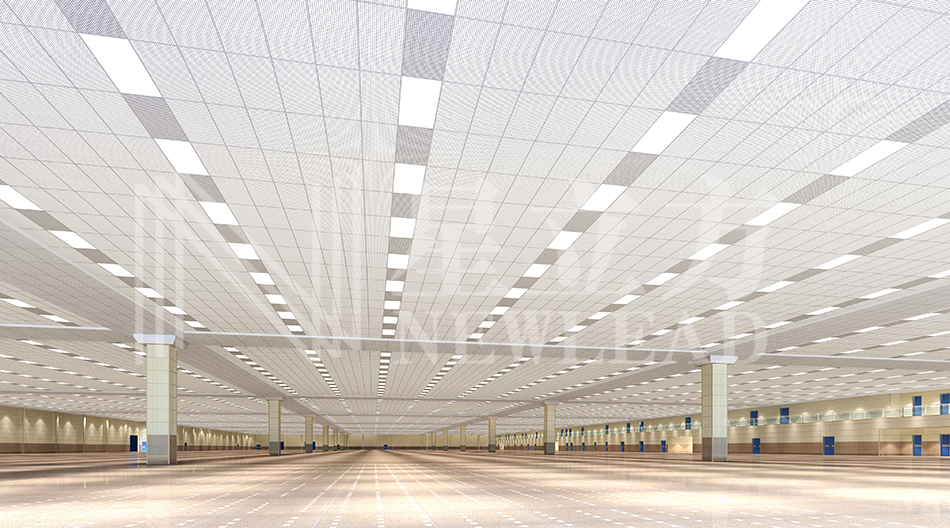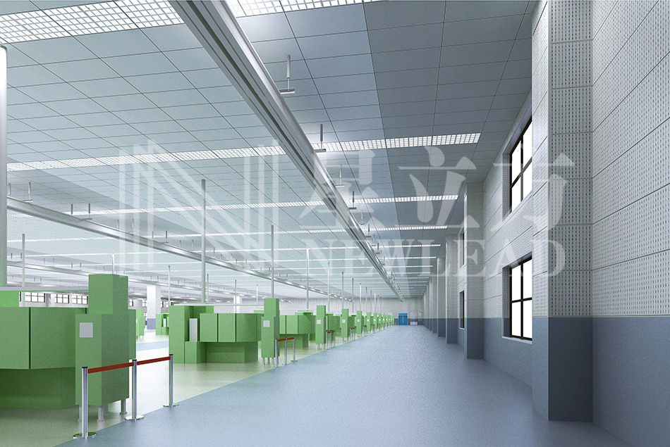 廠房車間特殊的頂上布置,大孔格柵和跌級(jí)龍骨的組合應(yīng)用,配套燈具散發(fā)的柔和光線