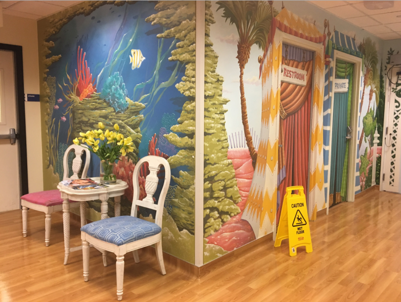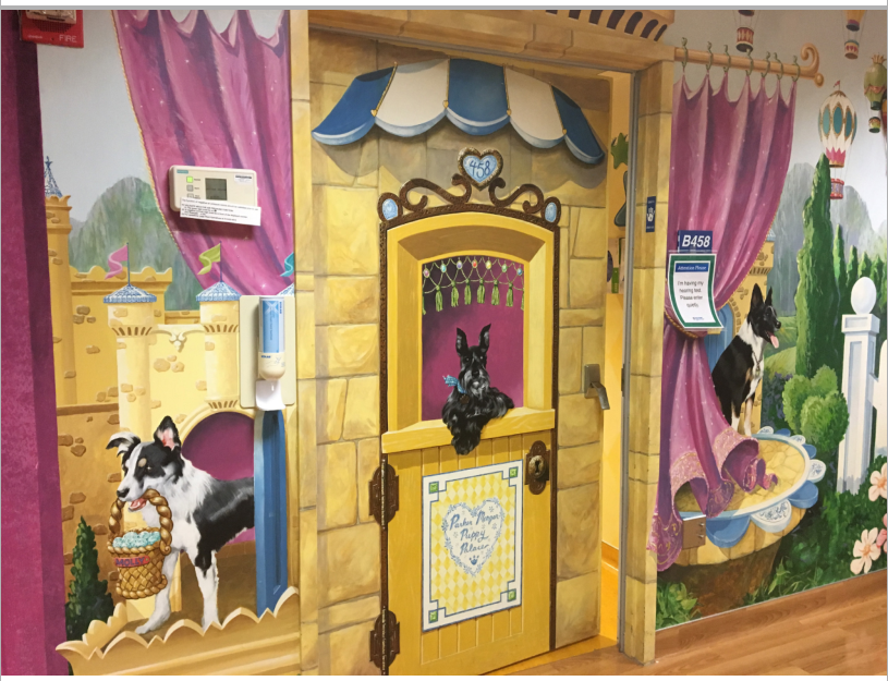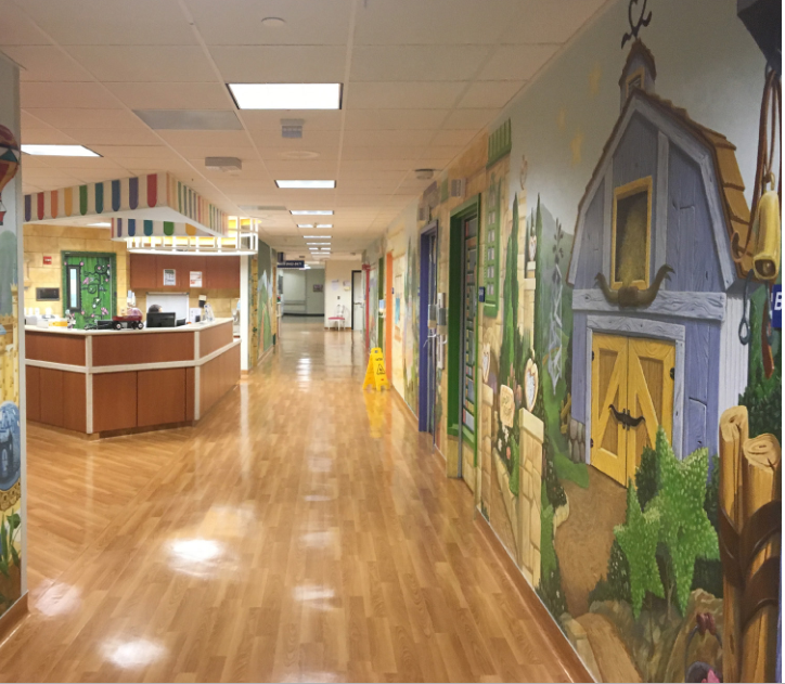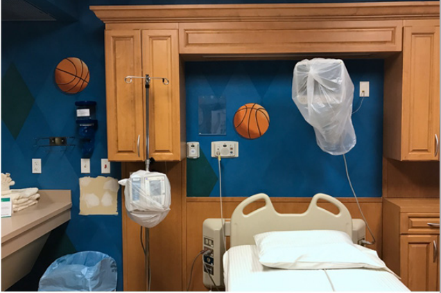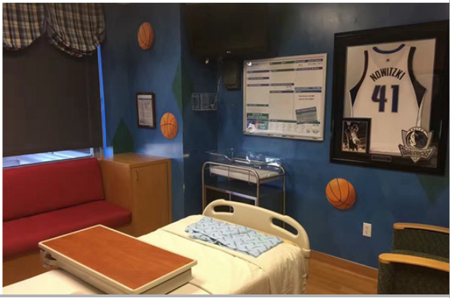 不僅如此,該院兒科的每一間病房還都有一個繪畫主題,小患者可以根據自己的喜好來選擇房間。我們參觀了一間以籃球為主題的空病房,房門上是達拉斯小牛隊的隊徽,墻壁上畫著各種與籃球有關的圖案,墻上還掛著諾維斯基的41號球衣。我想,如果一個小籃球迷在這樣的環境中接受治療,恐怕都會不想出院了吧?