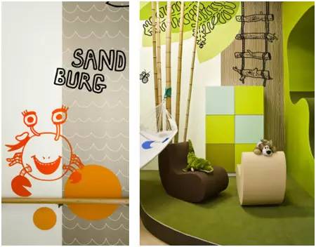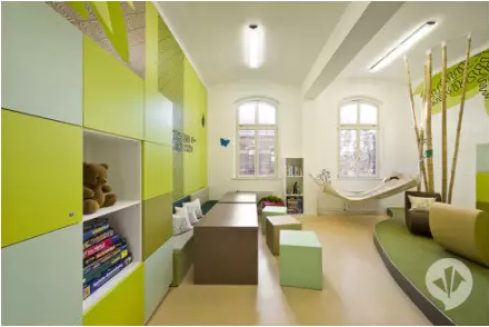 ②走廊應避免過于單調,可使用鎮靜色系——藍綠色系,這樣可以使兒童的緊張情緒得以放松、平緩。