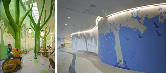 不同的科室,對色彩的設計要求有各有不同,消化科和心理科病房一般以黃色為主;外科多是以藍色和綠色為背景;康復科以棕色為主;急診室宜采用淺藍的冷色調;而兒童病區宜采用太空、海洋、森林等自然色彩格調,并以卡通人物和各種動物為背景。