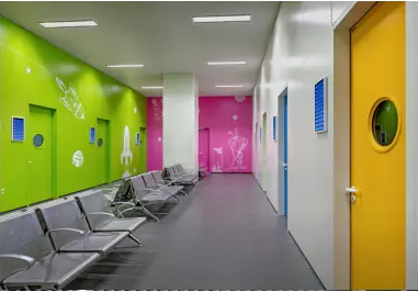 兒童醫院建筑應把握童趣這一設計要點,墻壁上可以繪制涂鴉風格的圖畫,五彩斑斕的色彩布局應統一、并且繁而不亂。每個區域的主體色調都可以有所不同,代表不同區域的分類。
