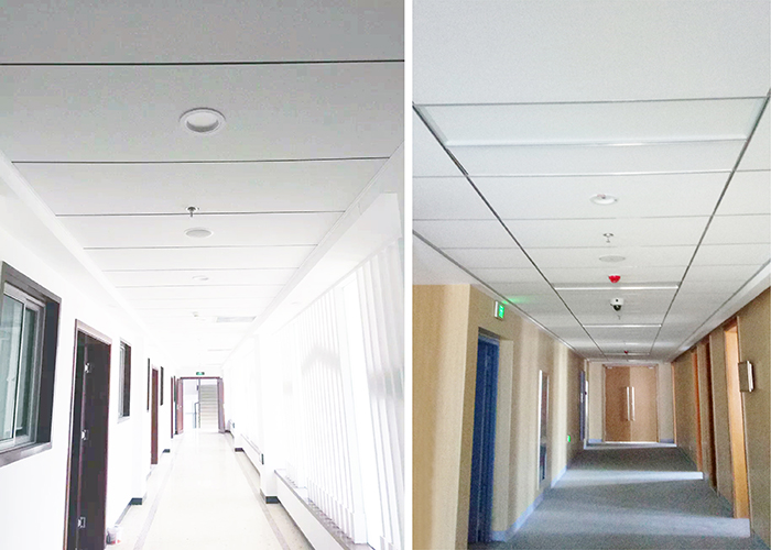 星立方高晶吊頂條板系列,在相對比較窄的過道空間,吊頂可以直接整板平鋪,該項目過道的兩種展現方式都是現在常用的方板與條板組合以及大條板應用,突破了傳統單調沉悶的過道吊頂,給人明亮舒適的頂上氛圍。