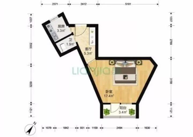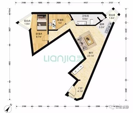 左下方向,像一個張開嘴的惡魔。兩室一廳一廚一衛雙陽臺。西北方向和東北方向兩個觸角式陽臺完成了房間的全部采光。