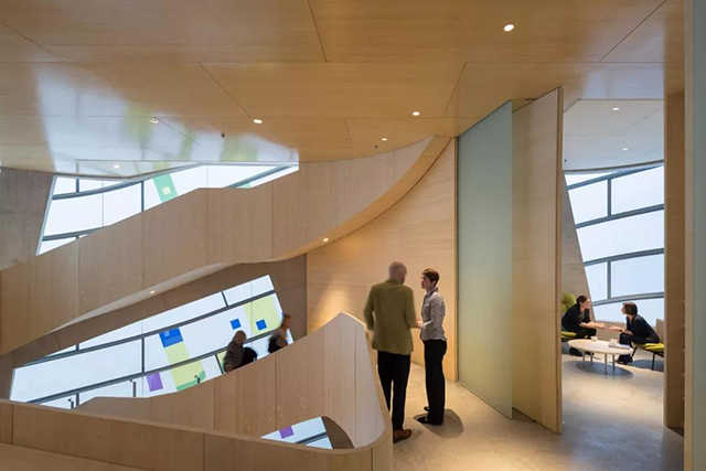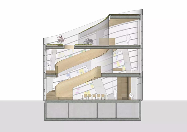 玻璃幕墻的幾何形狀為90厘米寬的水平條紋,像極了樂(lè)譜,沿著北立面的主樓梯流動(dòng)。同時(shí)面向主廣場(chǎng)的透明玻璃升起,成為標(biāo)志性的主入口。西面開(kāi)放空間設(shè)置了建筑的第二個(gè)入口,通向鄰近教堂的花園。建筑的頂部也有一個(gè)開(kāi)放花園,用于開(kāi)展瑜伽、太極拳等活動(dòng)或者會(huì)議。