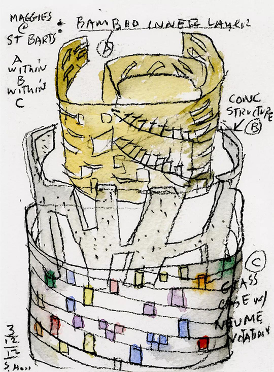 建筑師設(shè)計(jì)這個(gè)建筑時(shí)手繪的建筑正面水彩畫(huà) ©斯蒂文·霍爾
