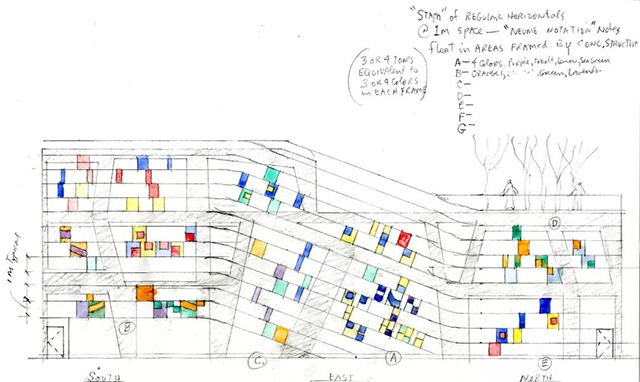 建筑的形式被設(shè)想成“船里面有船,里面的船里面還有船”。建筑結(jié)構(gòu)由分支化的混凝土框架承擔(dān),內(nèi)層是竹質(zhì)材質(zhì),建筑的外層是白色毛玻璃外墻,上面嵌有“紐姆音符”(13世紀(jì)的記譜法)形狀的斑斕色彩碎片,“紐姆”一詞源自于希臘語(yǔ)“pnevma”,意為“充滿生命的氣息”,這些斑斕的色彩碎片預(yù)示著生命的呼吸就像空氣的流動(dòng)、清風(fēng)的吹拂,給人以鼓舞的力量。