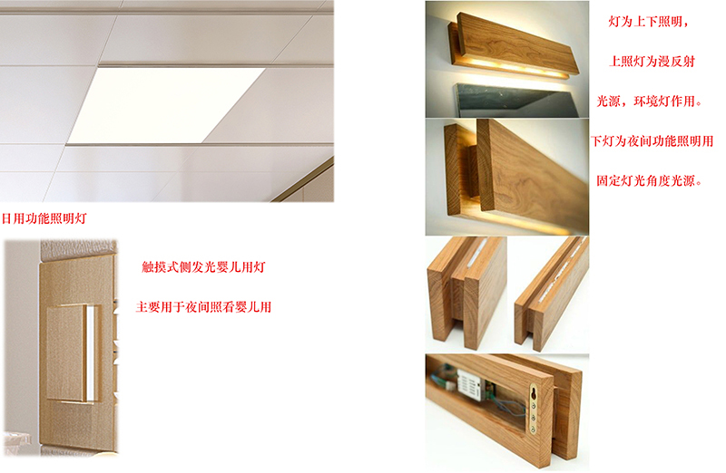 產科病房吊頂采用具有凈化室內空氣的功能型飾面板——負離子生態硅晶板,搭配常規的集成導軌,日用功能照明采用與吊頂搭配的LED平板燈,整體顯得干凈利落,另外還配置了觸摸式側發光嬰兒用燈,主要用于夜間照看嬰兒。