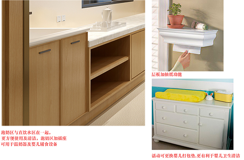 嬰兒奶粉沖泡區,將泡奶區操作臺與直飲水區放在一起,更方便使用及清潔,泡奶區加插座,可用于溫奶器及嬰兒輔食設備,下方還設置了奶瓶、杯具及設備收納層柜。