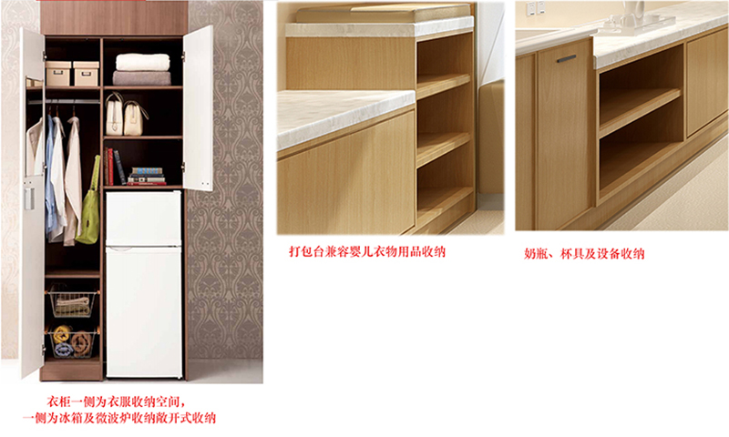 獨立嬰兒打包臺及衣物收納柜,活動可更換的嬰兒打包臺墊,右側加掛式層板抽紙功能,更有利于嬰兒衛生清潔。多功能陪床沙發與多功能家具柜,保持功能齊全,整潔美觀;