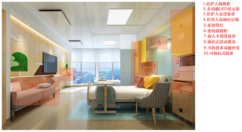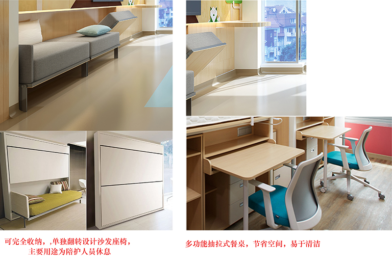 兒科病房整體色彩鮮艷活潑,多功能的抽拉式餐桌,節省空間,易于清潔。可完全收納的沙發座椅,用于陪護人員休息,亮黃色吊柜為陪護人員收納柜,另外還設計了密碼柜放置病人用品。