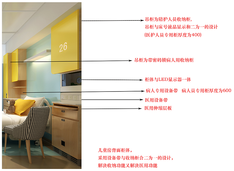 兒童房背面柜體,采用設備帶與收納柜二合一的設計,同時解決了收納功能和醫用功能。