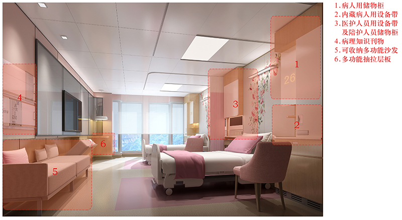 病房設置了一體化設備集成,將病人用儲物柜,醫護人員操作臺及設備帶,住院記錄單等都集成在整體家具柜內,突破傳統,充分利用使用空間