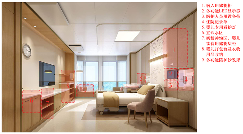 獨立嬰兒打包臺及衣物收納柜,活動可更換的嬰兒打包臺墊,右側加掛式層板抽紙功能,更有利于嬰兒衛生清潔。多功能陪床沙發與多功能家具柜,保持功能齊全,整潔美觀。