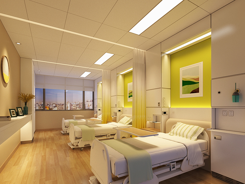 兒科病房整體色彩鮮艷活潑,多功能的抽拉式餐桌,節省空間,易于清潔。可完全收納的沙發座椅,用于陪護人員休息,亮黃色吊柜為陪護人員收納柜,另外還設計了密碼柜放置病人用品。兒童房背面柜體,采用設備帶與收納柜二合一的設計,同時解決了收納功能和醫用功能。