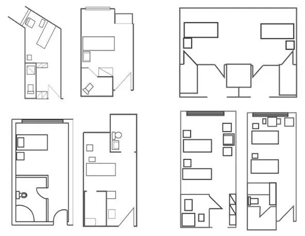 單人病房多采用家庭式或者賓館式設計,空間面積大、布局較合理,確保了病人空間的私密性并且營造了家庭氛圍,同時也保障陪護家屬的日常休息,設計比較人性化,但是價錢相對較昂貴,容易造成空間資源浪費。