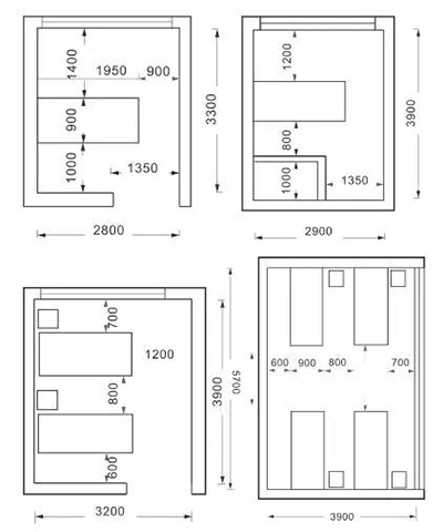 不同醫院的病房通道空間有所不同,病房種類決定了通道寬度,其中單人間病房條件優越,內部家具設備齊全,有足夠空間在通道處設置電視柜﹑櫥柜﹑沙發﹑陪護床等家具。二人間與三人間或者多人間病房通道空間相對較窄,所但是有醫院病房設計都要滿足最低尺度,既能保障病床轉動﹑轉移,又能滿足人體的基本活動的要求,一般單排病房的通道不小于1100mm,雙排病房內通道不小于1400mm。