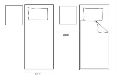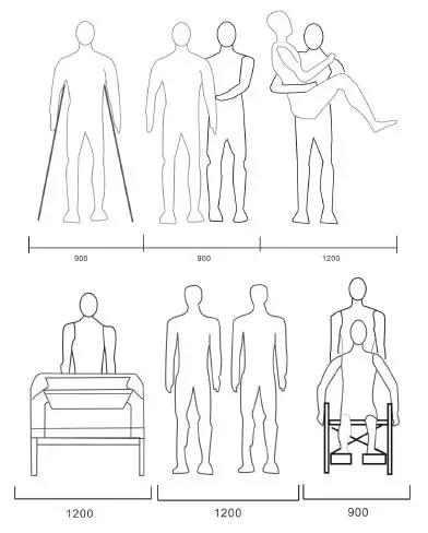 人體工程學是設計參考的重要標準之一,在不同空間環境下,設計的尺寸要求有所差異。病房空間設計及家具形狀尺寸要以人體工程學為基準,應在保障人體動作能夠在安全狀態下進行設計。病房的空間尺寸設計和人體的基本活動、醫療設備的通行轉移是分不開的,人體會有許多基本動作,如坐、立、臥、行等。單人正向通行的尺寸為600mm,側向通行尺寸為300mm,如圖5所示,病人坐輪椅通行寬度為900mm,醫護人員推病床時的通行寬度為1200mm,病床間的距離一般不小于800mm,如圖6所示。