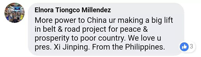 Elnora TiongcoMillendez:中國的“一帶一路”倡議為貧窮國家的和平與繁榮作出了巨大貢獻。我們熱愛您,習近平主席。菲律賓友人致。