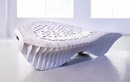 如果椅子由混合肥料組成,將會怎樣?近幾年,Terreform ONE和Genspace公司通過類似的工藝共同研發了兩張生物塑料椅:一種是馬車躺椅,由一系列白骨以參數化外形構成的,椅子上加了柔軟的墊子;另一種是兒童椅,由片段聯動組成,可調節成不同的形狀。