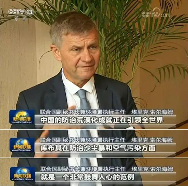 “庫布其沙漠是離北京最近的一個沙漠,以前被稱為北京頭上的一盆沙,現在這盆沙已經變成了綠色的盆景。”