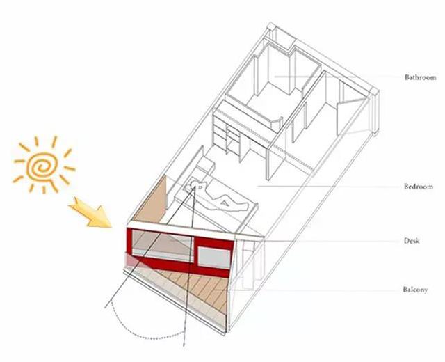 最后,陽(yáng)臺(tái)的設(shè)計(jì)對(duì)于病房和休養(yǎng)區(qū)十分重要,陽(yáng)臺(tái)一般設(shè)置于偏南向,不但可用于晾曬衣物,觀景休閑,還可在寒冷的冬季成為十分重要的活動(dòng)區(qū)域。從另一方面而言,陽(yáng)臺(tái)也起到反射遮陽(yáng)、控制自然光的作用,使自然光更加柔和地引入室內(nèi),不對(duì)老年人的視覺(jué)造成額外負(fù)擔(dān),創(chuàng)作出更加適合老年人生活的光環(huán)境。