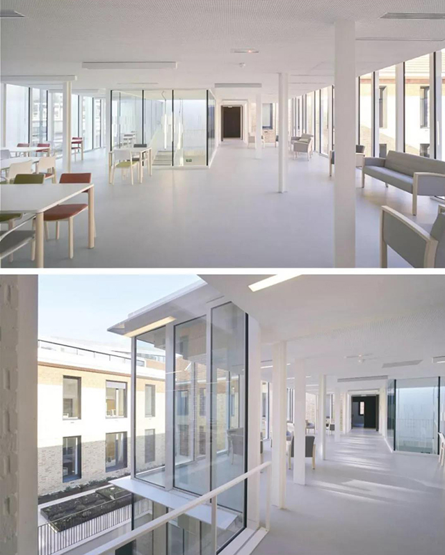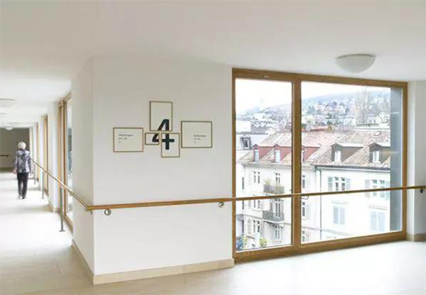 走廊過(guò)道是養(yǎng)老建筑中一個(gè)重要的公共空間,老人們希望在這樣的空間上停留、交流或者欣賞室外景觀,所以可以在走廊過(guò)道上采用全景落地窗和高窗相結(jié)合的開(kāi)窗方式,在保證老人安全的同時(shí)擁有良好的景觀視。