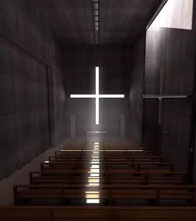 而為了滿足部分有信仰的老年人需求,宗教室也是不可缺少一個(gè)公共區(qū)域,此區(qū)域內(nèi)更加強(qiáng)調(diào)的是宗教氛圍和柔和的光影效果。以安藤忠雄的光之教堂為例,面積不大,光線也不耀眼,只是一面十字洞墻便帶給人們震撼和神圣。