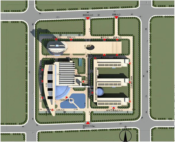 病房的平面選址,宜避開人口高密度及人流量大的地帶,比如高架橋、公交、地鐵等交通樞紐,宜盡量選擇綠化隔離帶密集的區域以及周邊景觀相對良好的安靜區域,見圖1所示。