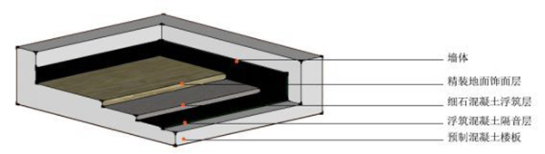 當然,材料可以替換為其他隔聲性能良好的材料。比如將輕鋼龍骨石膏板改為吸聲性能良好的礦棉板。將木質門更換為隔聲性能良好的鋼門,將單層玻璃改為雙層中空玻璃。而樓板層的隔聲降噪設計,由瓷磚換成仿制地毯樣的耐磨易于清理的隔聲量好的材料。基層與面層中間設置隔音層,見圖3所示。