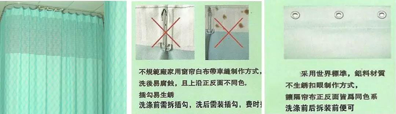 為了便于拆洗,窗簾隔簾上沿布頭需采用洗滌后不易生銹的鋁合金或不銹鋼金屬材質雞眼扣環制作(不采用白布帶插勾縫制方式),并于每0.2米制作1個扣環,使用S型鉤吊掛,該制作掛扣方式拆洗安裝速度較帶插勾縫制方式快5倍以上。