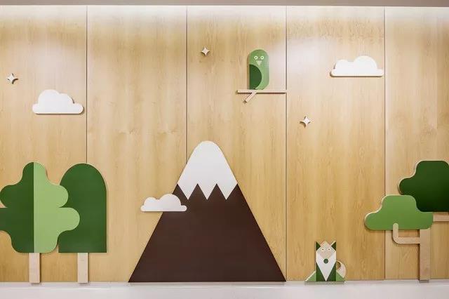墻壁以及玻璃上常常會出現(xiàn)山、云、等自然元素圖形,還有樹木、抽象卻可愛的動物甚至宇宙飛船等卡通形象圖案。