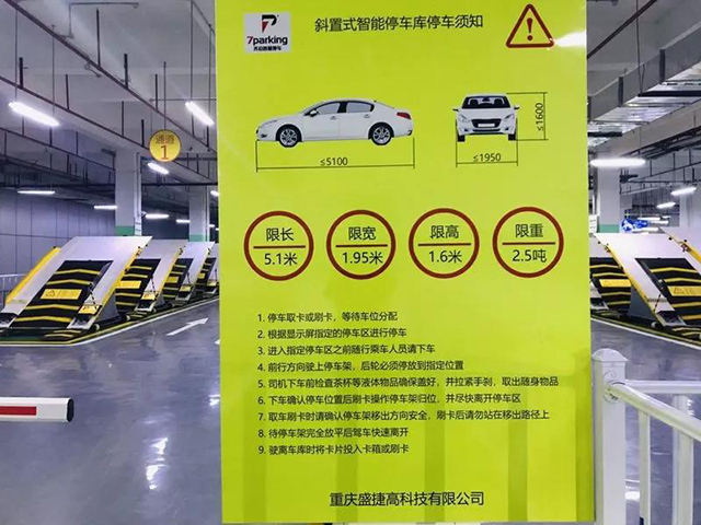 平面斜置式智能停車庫對車的規格也是有要求的,車身長度不超過5.1米,寬度不超過1.95米,高度不超1.6米,車重不超2.5噸。