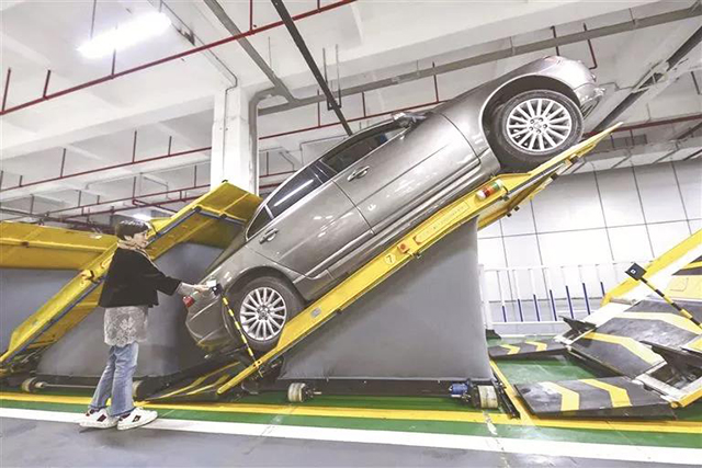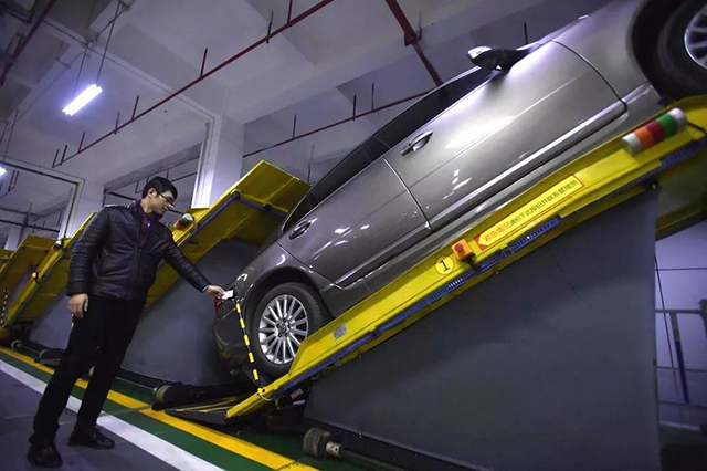 這種新的斜置式停車方式,車主只需要將車開上智能停車架,停車架就自動傾斜并停入車位,