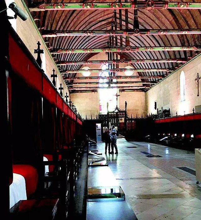 大廳入門一側的墻上高掛著耶穌受難的雕像,另一側則是莊嚴肅穆的小教堂。兩側的高窗是修女們休息時用于觀察患者的窗口。