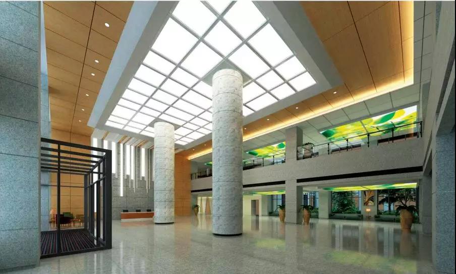 公共區(qū)域采用LED 平板燈,采用LED燈珠作為發(fā)光光源,通過導光板將燈光均勻分散于發(fā)光面,具有亮度高、照明均勻、光線柔和和無交流頻閃等特點。此外顯色性好,日光的顯色指數(shù)是100,LED光源的顯色指數(shù)可達95,顯色性高的光源對顏色的表現(xiàn)較好,所看到的顏色接近自然原色。