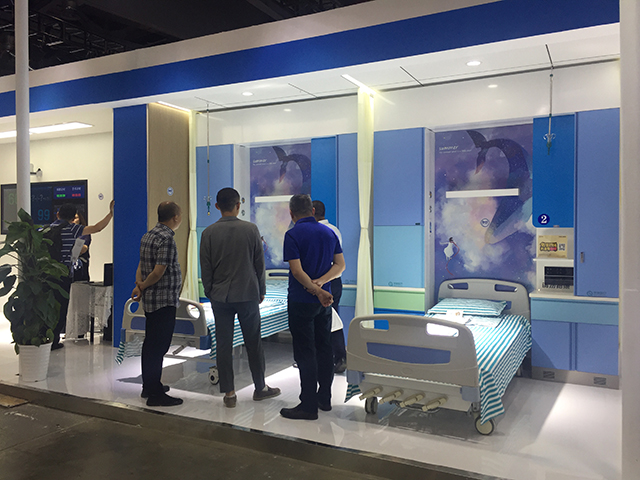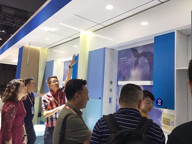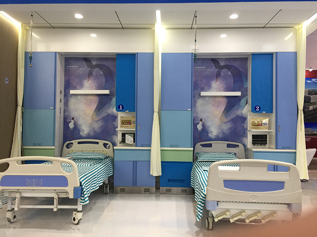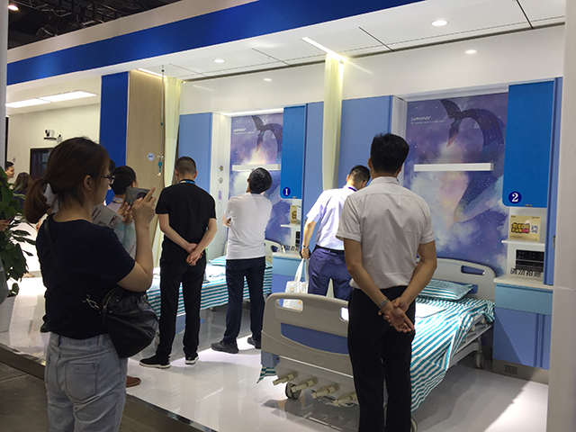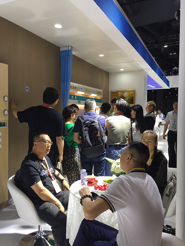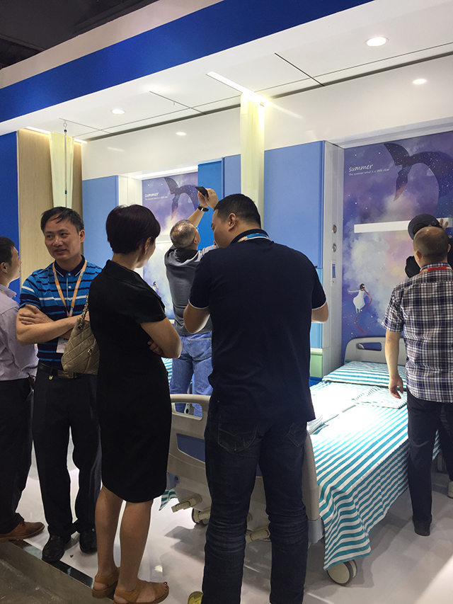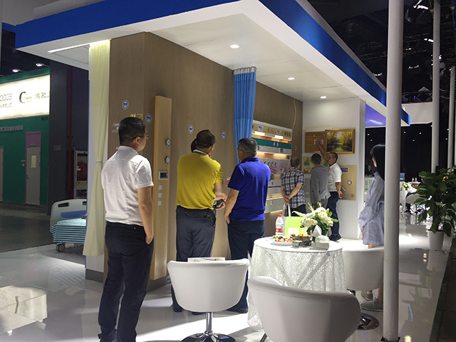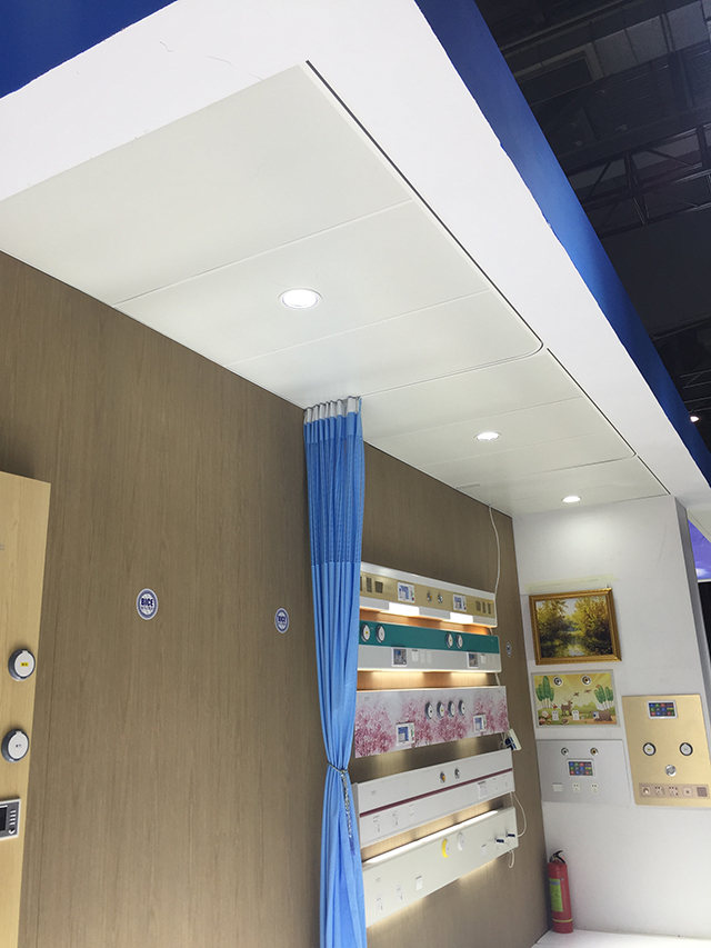星立方獨有的新型醫療吊頂吸引了很多參觀者的關注,包括一體化病房的燈軌龍骨、暗藏式輸液龍骨、暗藏式L型隔簾龍骨以及負離子生態硅晶板產品的功能性等,不僅解決了醫療吊頂的基本需求,吊頂面板、裝飾龍骨、隔簾和輸液軌道處于同一平面,讓整個頂面更加美觀,一次安裝,節約了工程造價。