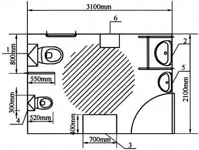 圖2是某醫院公共廁所平面圖,此平面按當前各類規范標準《民用建筑設計通則GB50352-2005》、《城市公共廁所設計標準2016》、《無障礙設計規范GB50763-2012》的相關規定進行設計,從細節以及總體來看均沒有問題。