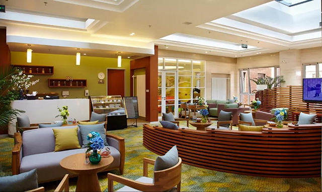 明亮雅致的門廳兩層通高,面向東南的弧形落地玻璃窗,使大廳格外明媚舒適,室外的疊水、綠化盡收眼底,大廳內的弧形服務島臺、弧形吊頂、木色飾板、木制座椅扶手使人感到極為親切和自然。醫院中還設有咖啡廳、超市等便民設施,與門廳串聯的咖啡廳飄來陣陣香甜的味道,讓步入其中的患者感覺這里并非醫院,而是一個溫馨愉悅的服務場所。