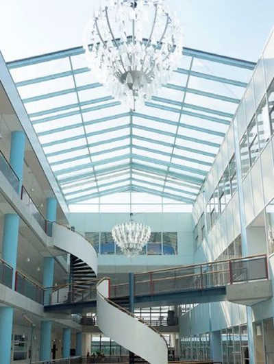 在格羅寧根大學醫療中心中庭,醫院在中午較熱時間段開敞電動天窗,在夜間及寒冷時期將其關閉 ;在阿姆斯特丹JaKarta 酒店內同樣可以見到具有