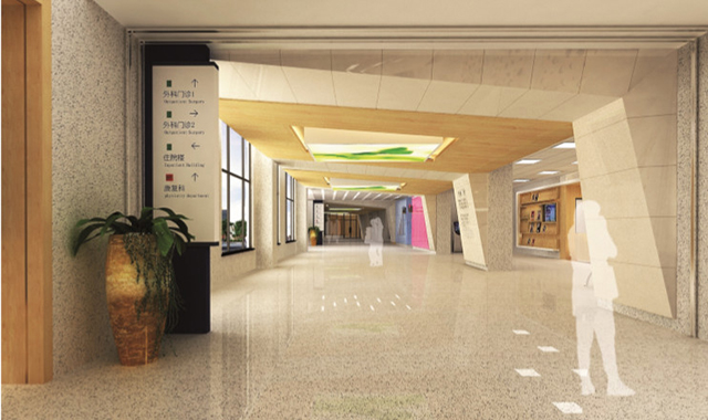 (連云港市第一人民醫院高新院區門診大廳兩側景觀用自然照明和人工照明相結合的方式打造了 “ 山水洞天 ” 的景觀)