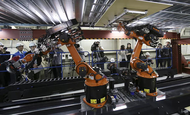 在日本清水建設的實驗設施里,匯集了各種類型的機械臂應用,包括能自動焊接的「焊接機器人」和裝天花板的「天花板施工機器人」▽