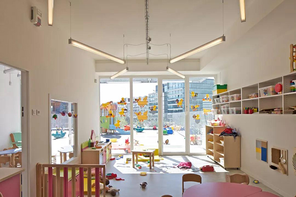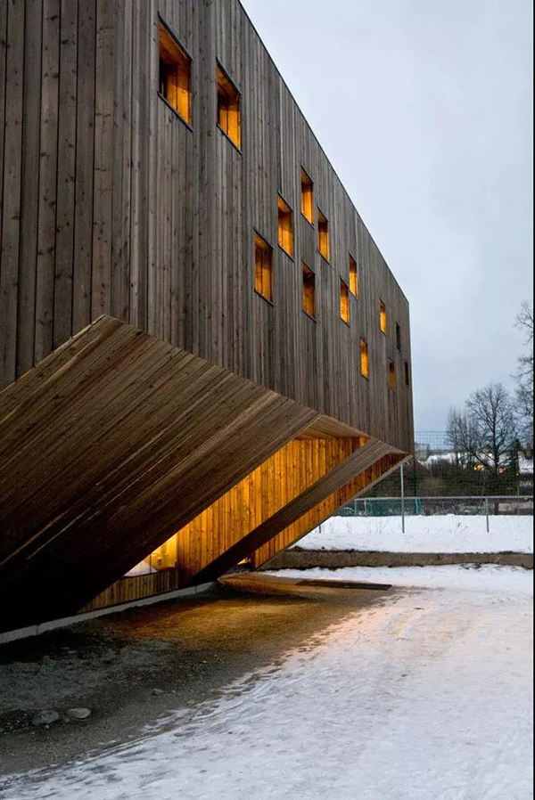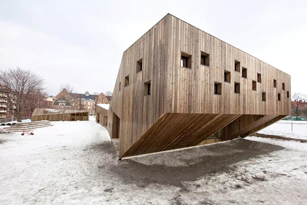 挪威奧斯陸的法格堡幼兒園,在整體設(shè)計(jì)上,充滿了藝術(shù)感。它的外觀看起來很普通,是樸素而有質(zhì)感的原木,但遍布外圍墻壁的小洞,卻可以很投巧的將自然光引入室內(nèi)。而室內(nèi)設(shè)計(jì),也充分利用了光學(xué)之美,打造出五彩斑斕,卻又不過分刺眼炫目燈光。