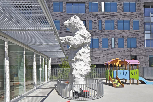 長頸鹿的存在,只是為了將建筑銜接起來。所以,第一眼,你會(huì)被這只吃著樹葉的長頸鹿吸引。之后,你會(huì)看到一只北極熊正試圖爬上臺(tái)階。而一只瓢蟲,正慢慢的試圖走向庭院內(nèi)部。如果你步入幼兒園,在很多細(xì)節(jié)之處,都會(huì)看到不同的動(dòng)物。