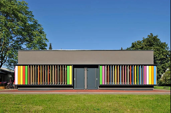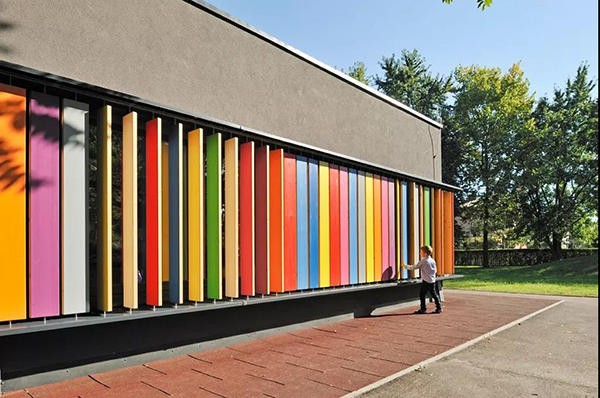 你能看到整個(gè)房子的外圍,是由彩色的垂直條形木板構(gòu)成。每一個(gè)條形木板的內(nèi)外兩側(cè),都顏色不一,而每一塊條形木板,也是可以轉(zhuǎn)動(dòng)的。這就讓孩子們,可以充分的發(fā)揮自己的創(chuàng)造力,讓幼兒園每一天都大變身。