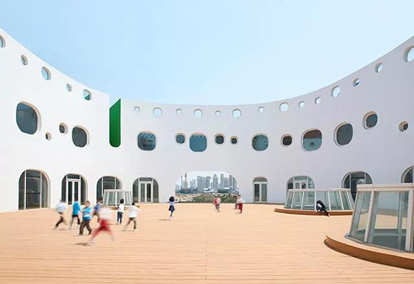 天津環(huán)路幼兒園的外型,看上去像一個(gè)巨大的甜甜圈。它的圓形邊緣和窗戶,讓整個(gè)建筑充滿了流動(dòng)的線條感,并且明麗的顏色,增加了建筑本身的動(dòng)感和時(shí)尚,有著讓人眼前一亮的驚艷。