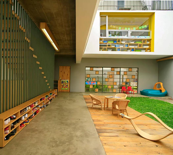 外露的混凝土、空心磚、原木地板,這些充滿現(xiàn)代感的打造,讓幼兒園散發(fā)著濃郁的藝術(shù)感。如果不是內(nèi)部彩色的布局,很容易營造出低調(diào)奢華會(huì)所的的感覺。