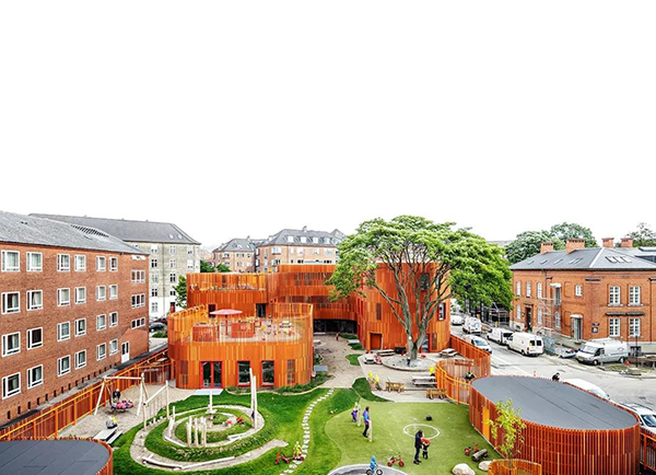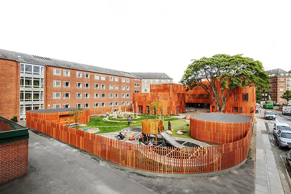 這所位于哥本哈根的幼兒園,由五棟小房子組成,每所房子都有獨(dú)特的建筑外觀,和美麗的綠色屋頂花園。該幼兒園使用大量裸體的紅磚,并且立面不是用傳統(tǒng)的水平轉(zhuǎn),而是由垂直的薄片磚組成,這就增加了建筑的立體性和藝術(shù)感。